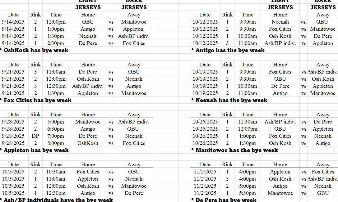 Games will take place on Sundays. The majority of games will take place at the CCC while De Pere Ice Arena will be utilized if needed.
