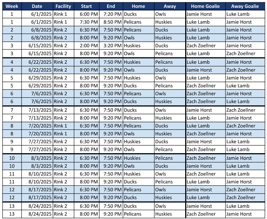 The majority of games will start at 6:30pm or 8pm ... however, some games may need to be move based on ice availability.