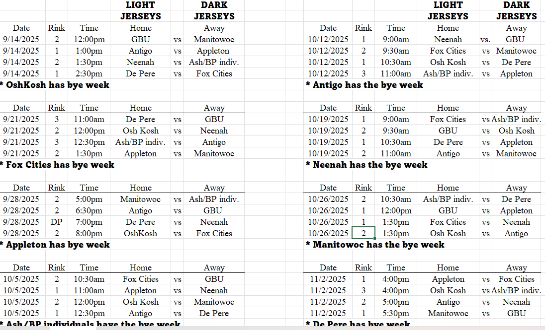 Games will take place on Sundays. The majority of games will take place at the CCC while De Pere Ice Arena will be utilized if needed.